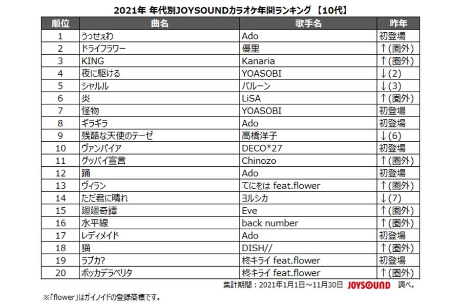 「2021年JOYSOUNDカラオケ年間ランキング」【10代編】のランキング表