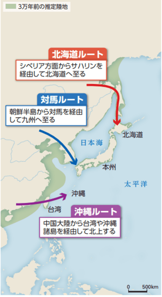 A. 象や鹿などの動物を追いかけているうちに 辿り着いたと考えられる。ルートは北海道、対馬、 沖縄の3つの説が存在する。