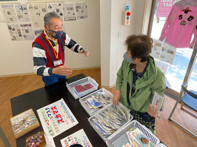 古着ショップや飲食店などが立ち並ぶ横須賀市の繁華街「ドブ板通り」。京急線汐入駅のすぐそばにあるNPO法人全国生涯学習まちづくり協会の汐入オフィス(本町3丁目)で、「スカマス」は売られている。恐竜やネコの刺?(ししゅう)、軍隊風ワッペンが付けられたもの、ペンギン柄のプリント生地をマスクに加工したものなどデザインは様々。いずれも手作りだ。