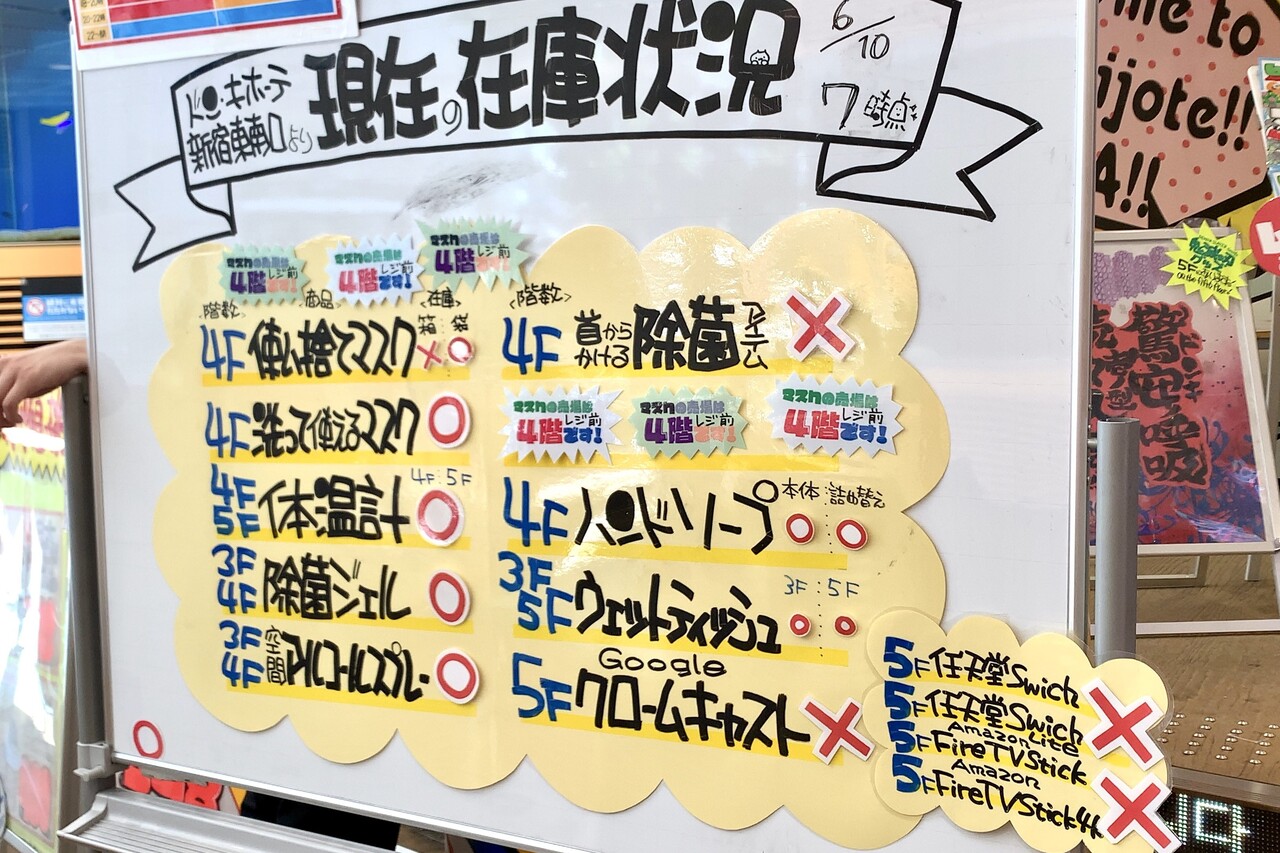 新型コロナウイルス流行の余波を受け、現在多くのドンキでは店頭にホワイトボードを設置し、人気商品の在庫状況や陳列フロアを明記しているのだ。