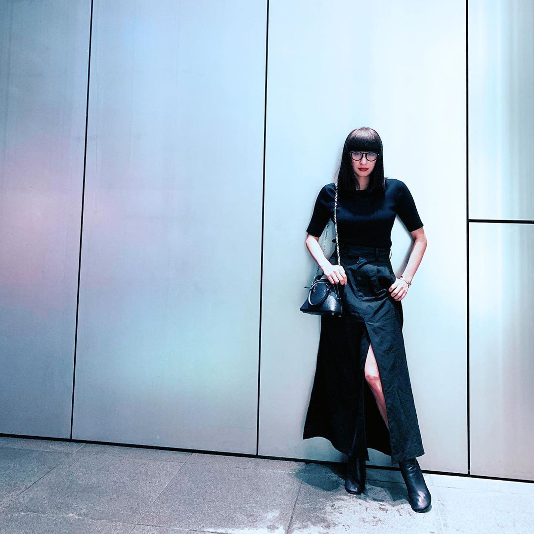 写真は、体を横に向けた浅田さんが凛としたまなざしでカメラ目線を送っているものと、正面を向いて腰に手を当てたポーズを取っているものの2枚。かけている眼鏡や、肩から下げているかばん、ブーツなど、浅田さんの服装は全て黒色で統一されています。