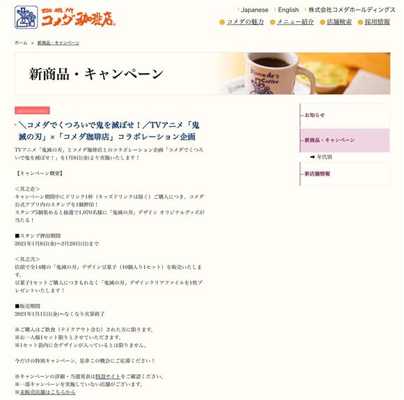 8日から始まる「鬼滅の刃」とのコラボ企画について告知する珈琲所コメダ珈琲店の公式サイト