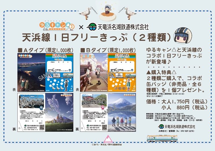 フリーきっぷは原作に登場する「気賀」「浜名湖佐久米」駅をイメージしたデザインで、AB二種類どちらも1,000枚限定で発売。両方購入すると非売品のコラボ缶バッジを1個プレゼント。価格は大人1,750円、小人880円。