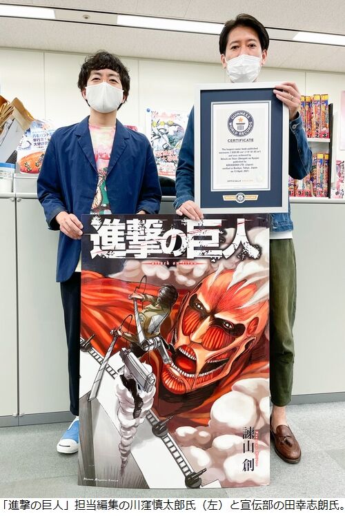 今回のギネス認定について、「週刊少年マガジン」編集部「進撃の巨人」担当編集の川窪慎太郎氏は「宣伝部から提案を受けた際は『え、進撃ファンなら余裕で達成してくれるでしょ』と返答したものの、実際に価格と冊数を聞いて内心ドキドキしていました。結果は皆様ご存知の通り2分とかからず完売、そしてギネス達成となりました。価格に見合う素晴らしい本を作ってくださった図書印刷様と、いつでも一緒に作品を盛り上げてくれる進撃ファンの皆様に感謝します。ありがとうございます!」とコメント。